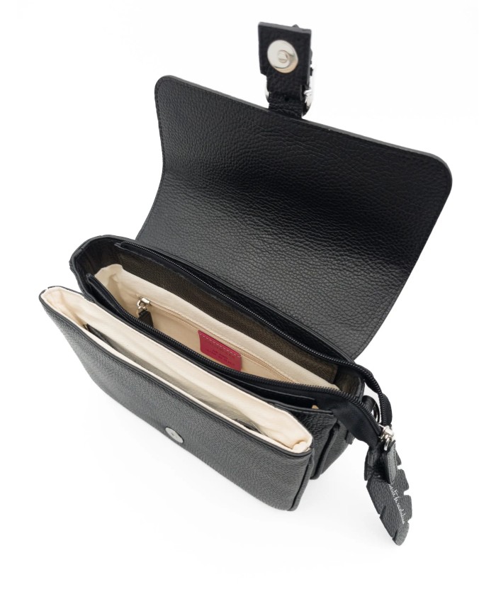 Realizzata in vera pelle martellata Made in Italy, Cocca esprime la sua eccellenza nella costruzione e nell’organizzazione interna. L’interno è suddiviso in due comparti: il comparto principale, più capiente, è chiuso da zip con tira lampo in pelle e include una tasca interna con zip; il secondo comparto, più compatto, è dotato di una tasca aperta in pelle tono su tono. Il tutto è rifinito con fodera in 100% canvas di cotone.