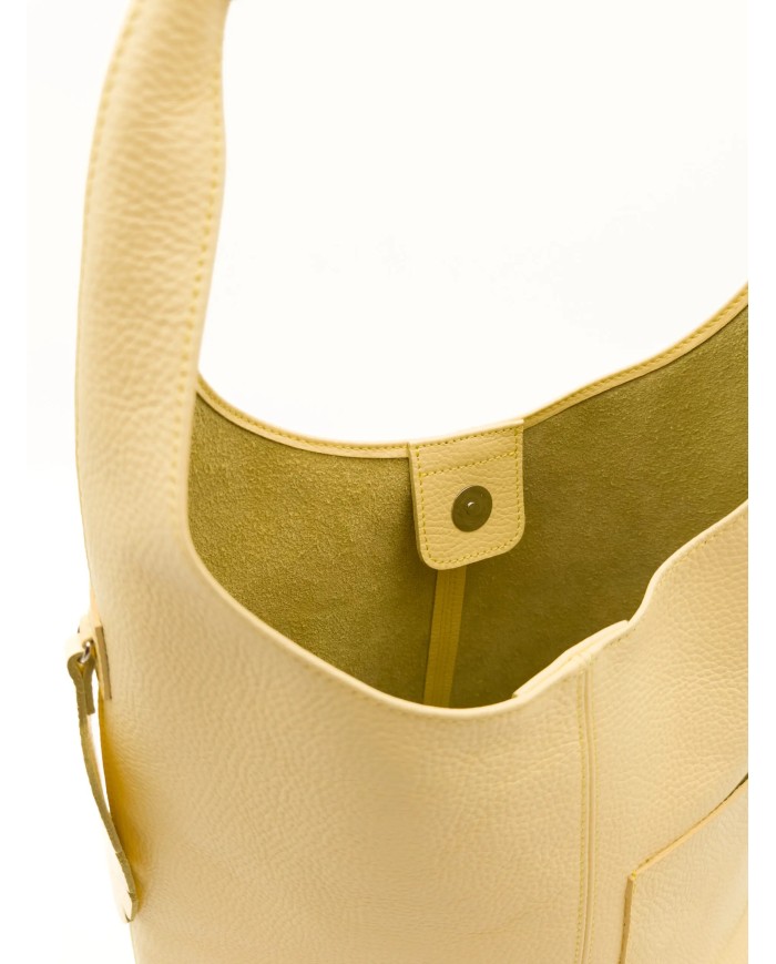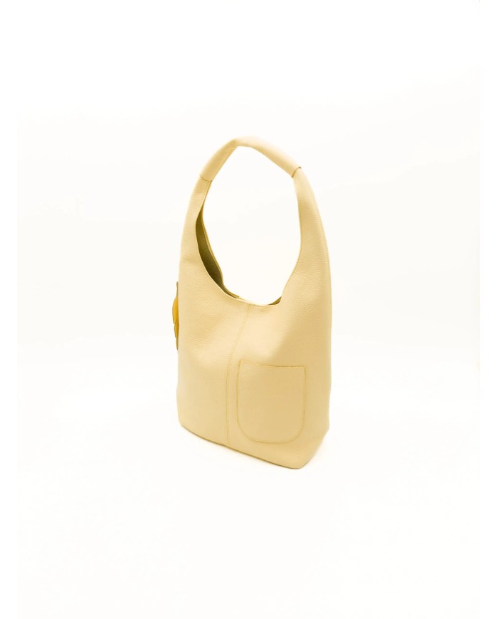 Il suo design essenziale è impreziosito dal dettaglio distintivo della tasca posteriore ispirata alle tasche dei pantaloni, un elemento iconico che aggiunge un tocco casual e attuale. La chiusura con calamita garantisce praticità e sicurezza, mentre il manico ergonomicamente integrato e rinforzato assicura una portabilità confortevole e resistente, ideale da indossare a spalla durante tutta la giornata.